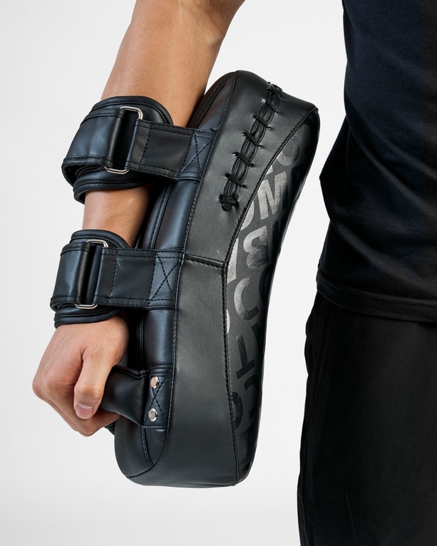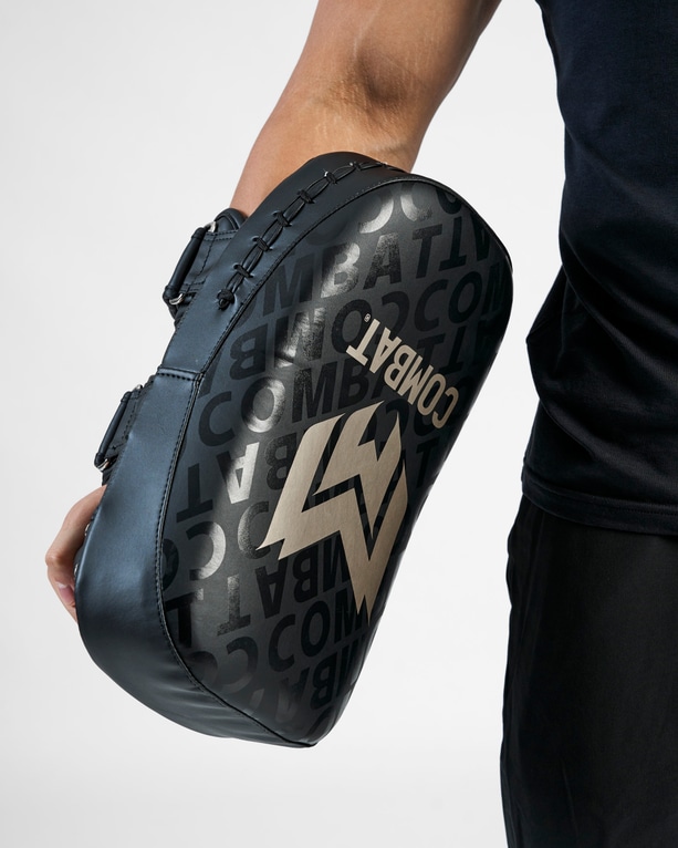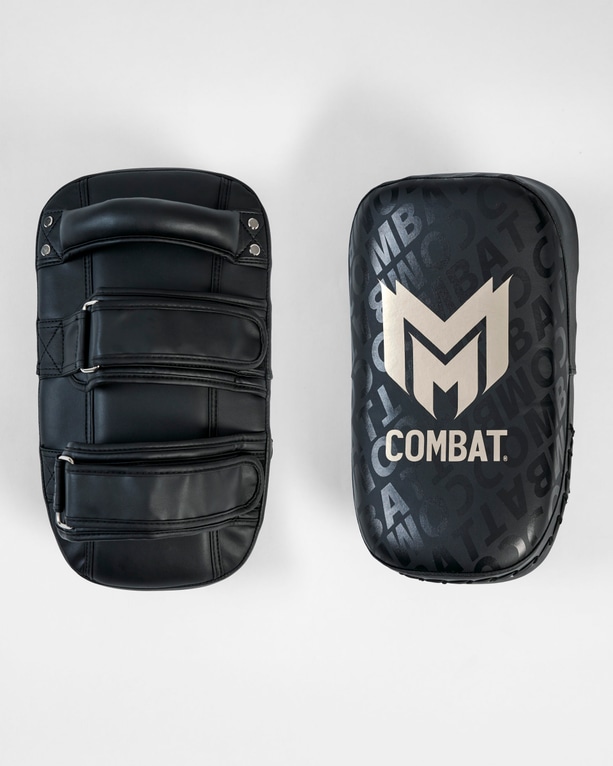 MM Combat Kick Pad i Black/Gold-design – robuste sparkepuder til effektiv sparring og sparketræning. Fremstillet i slidstærkt kunstlæder med stor træfflade, der tåler hårde spark og giver træneren stabilitet og kontrol.