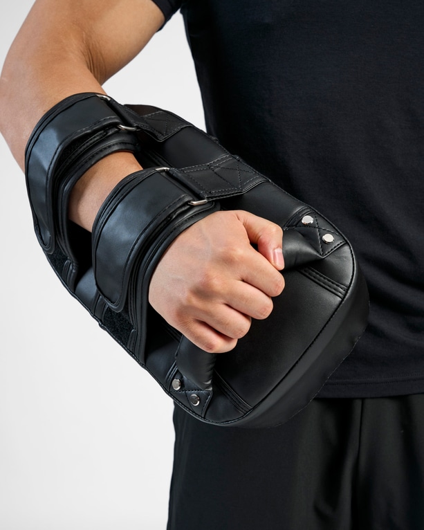 Sparkepuderne har to velcrolukninger og et solidt håndtag, som sikrer at de sidder fast på armen og giver et stabilt greb. Her anvendes en klassisk velcrovariant for enkel justering og pålidelig fastgørelse.