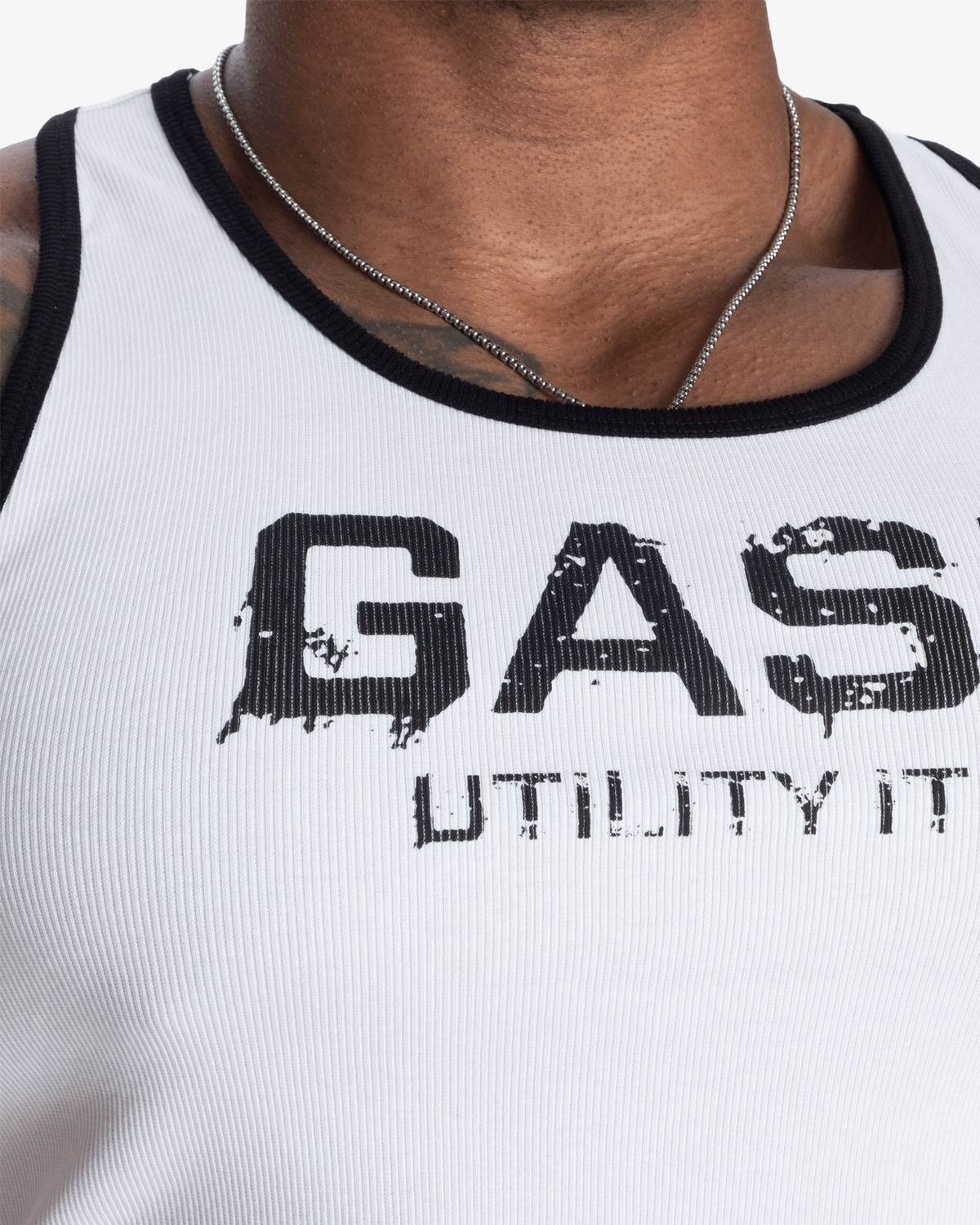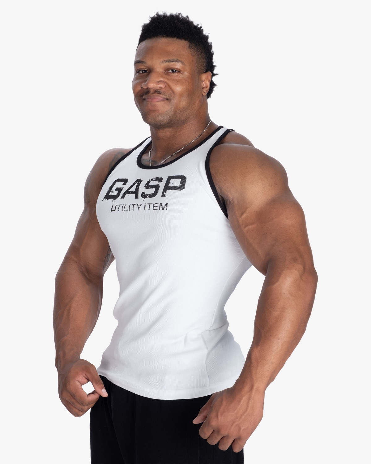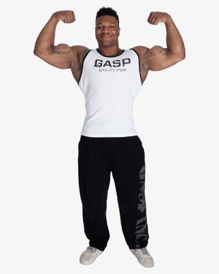 Toppen er lavet i et ribbet materiale af bomuld og lycra som giver en fleksibel pasform der sidder sikkert gennem hårde træningspas og mange vaske. Rå kanter og tydelige GASP prints over brystet og i nakken giver den kompromisløse bodybuilding attitude.